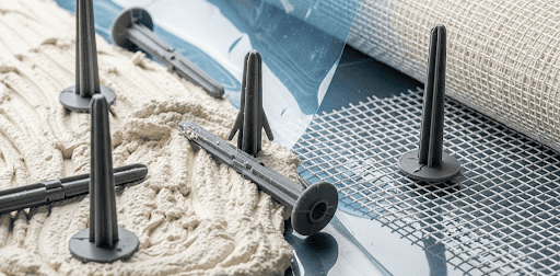 Монтаж заподлицо (вровень с поверхностью) или специальный «скрытый» монтаж, когда фрезой вырезается гнездо, дюбель утапливается, а сверху закрывается «пробкой» из того же утеплителя.